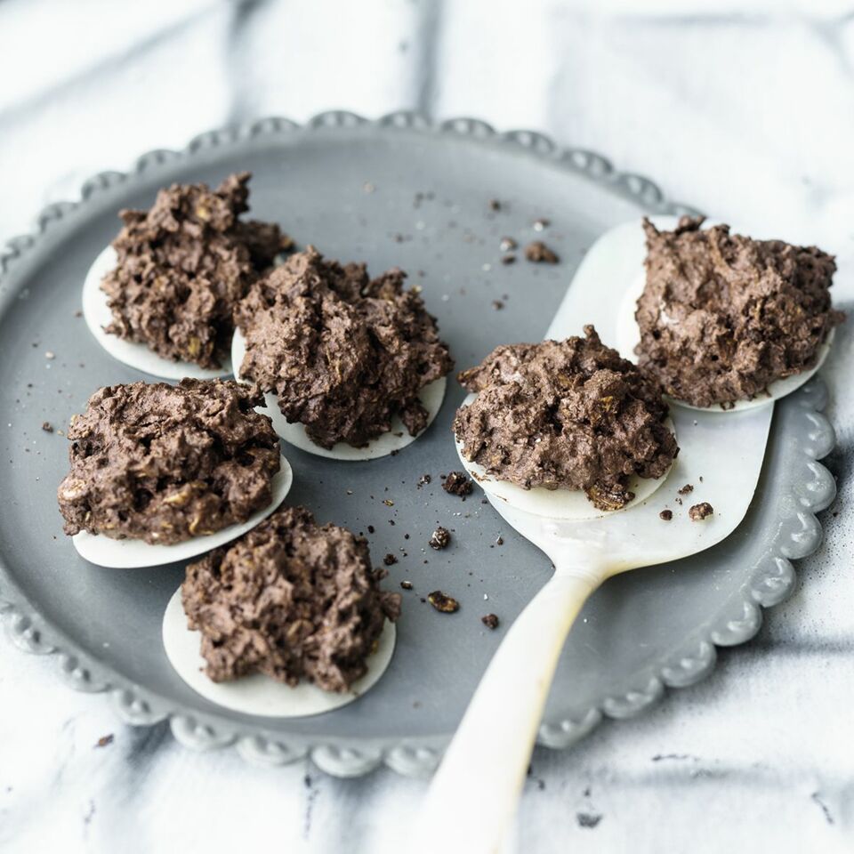 Gemahlene Mandeln, Kakao und Haferflocken in einer Schüssel gut mischen. Den Eischnee dazugeben und mit einem Teigspatel unterheben, bis ein zäher Teig entstanden ist. Nach und nach mit zwei Teelöffeln kleine Teigportionen abnehmen und in Häufchen auf die Oblaten setzen. Dabei etwas flach drücken.
