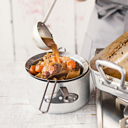 Den Fond durch ein feines Sieb in ein Gefäß abgießen, Knochen und Gemüse abtropfen lassen und danach wegwerfen.