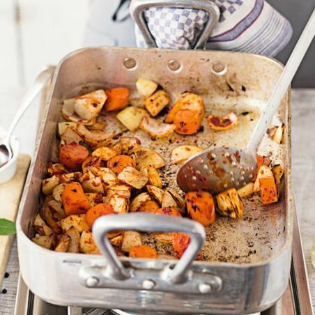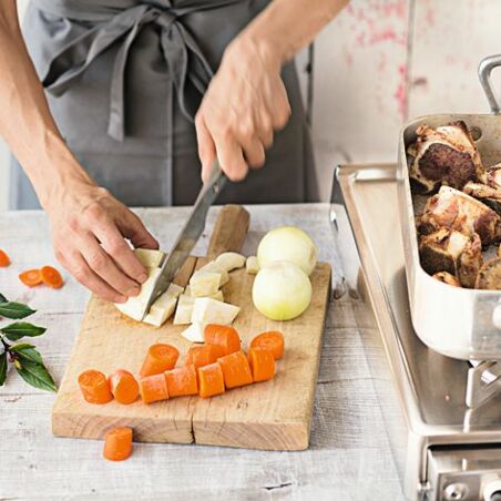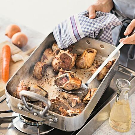 Das Öl in einem Bräter erhitzen, die Knochen darin in ca. 10 Min. dunkelbraun anbraten.