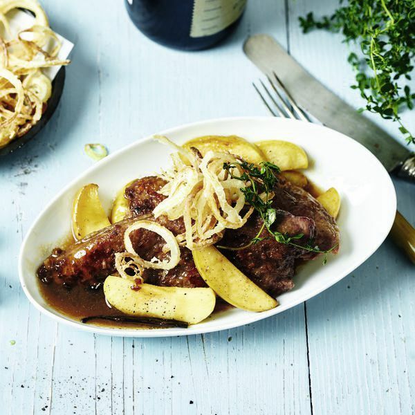 Die Leberscheiben auf Teller geben und die Sauce darüberlaufen lassen. Die Äpfel daneben und die Zwiebeln darüber verteilen.