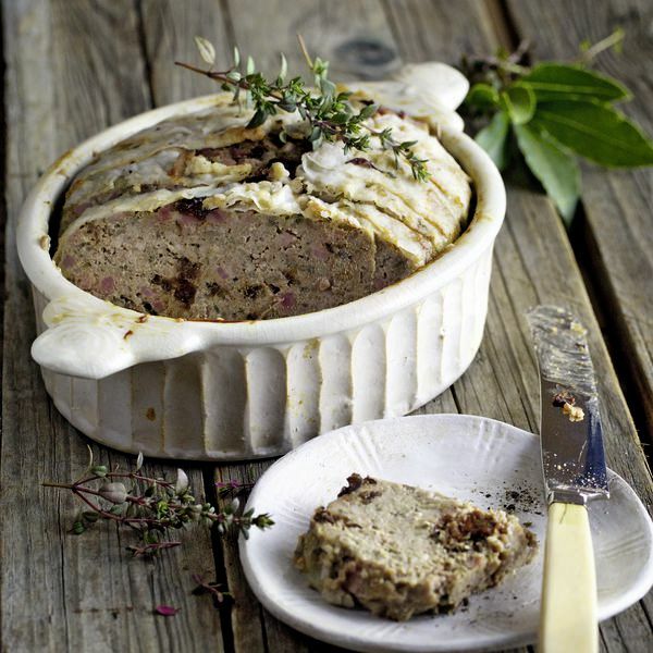 Form in eine tiefe Bratenreine stellen. So viel kochendes Wasser in die Reine gießen, dass die Form zu zwei Dritteln darin steht. Die Terrine im Ofen (Mitte, Umluft 130°) 2 Std. garen. Herausnehmen, kurz abkühlen lassen und Deckel oder Alufolie entfernen. Mit Frischhaltefolie bedecken und mit einem passenden Brett beschweren. Bei Raumtemperatur abkühlen lassen, dann 24 Std. kalt stellen.