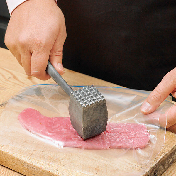 Zum Panieren des Schnitzels das Mehl auf einen Teller geben, die Semmelbrösel auf einen zweiten. Das Ei in einem tiefen Teller mit der Milch verquirlen. Das Schnitzel trocken tupfen, zwischen zwei Lagen Frischhaltefolie mit der flachen Seite des Fleischklopfers flach klopfen, salzen und pfeffern. Erst im Mehl wenden und den Überschuss abklopfen. Dann durch das Ei ziehen und schließlich in den Semmelbröseln wenden.