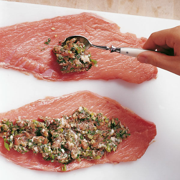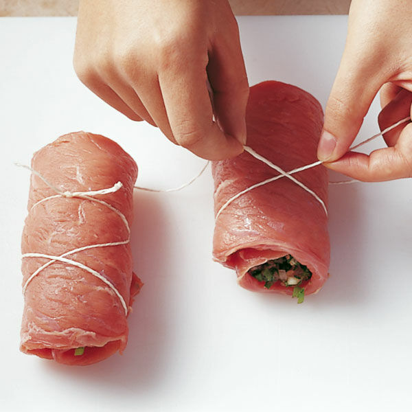 Die Frühlingszwiebeln waschen, putzen und klein schneiden. Die Kräuter waschen, trockenschütteln und die Blättchen fein hacken. Die Bratwurstfülle in eine Schüssel drücken, mit Frühlingszwiebeln und den Kräutern mischen und gleichmäßig auf die Schnitzel streichen (Step 2). Die Schnitzel wie Rouladen aufrollen. Die Enden mit Rouladennadeln feststecken oder die Röllchen mit Küchengarn binden (Step 3). Die Röllchen in Mehl wenden, überschüssiges Mehl abklopfen.
