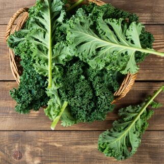 Den Grünkohl waschen und die Blätter vom Strunk lösen. In eine große Schüssel geben.