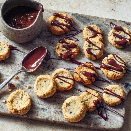 Die Kekse im heißen Backofen ca. 10 Min. backen, bis sie leicht gebräunt sind. Herausnehmen und abkühlen lassen. Inzwischen die Schoko-Drops in eine hitzefeste Schüssel geben und über dem heißen Wasserbad schmelzen. Die Nusskekse damit verzieren.