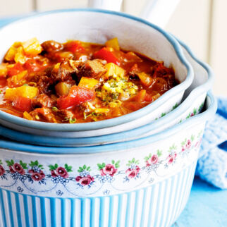 Das Butterschmalz erhitzen und die Speckwürfel darin bei mittlerer Hitze ca. 5 Min. anbraten. Zwiebel- und Knoblauchstreifen zugeben und hellbraun anschmoren. Beide Paprikapulver darüber streuen und durchrühren. Tomaten- und Paprikastücke sowie die Gewürze zugeben und die Fleischbrühe angießen. Zugedeckt mindestens 30 Min. schmoren lassen. Dabei gelegentlich umrühren und bei Bedarf etwas Wasser nachgießen.