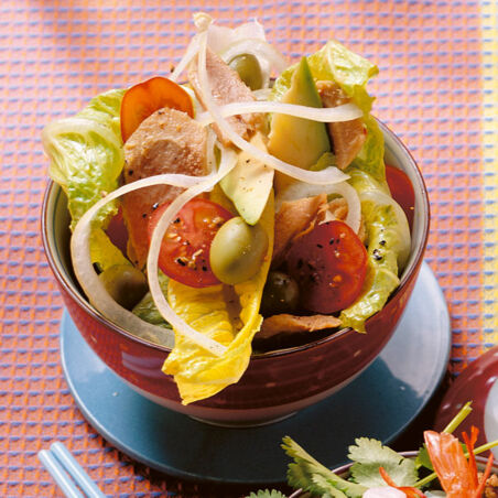 Tomaten waschen, Stielansätze entfernen. Tomaten in dicke Scheiben schneiden. Gemüsezwiebel schälen, in nicht zu dünne Scheiben schneiden und zu Ringen aufblättern. Avocado schälen und längs halbieren, den Kern auslösen und das Fruchtfleisch längs in Spalten schneiden. Tunfisch abtropfen lassen und in Stücke zerpflücken. Alles mit den Oliven auf dem Salat anrichten.