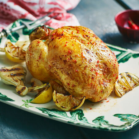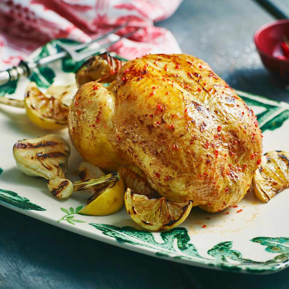 Hähnchen auf den Rost legen und in ca. 1 ½ Std. schön braun grillen, dabei ab und zu wenden und alle 15 Min. mit Marinade bestreichen. Jetzt eventuell mit dem Fleischthermometer die Kerntemperatur prüfen, sie soll 80° haben. Dann den Rost höher hängen und das Hähnchen bei geringerer Hitze noch 15 Min. ziehen lassen. Perfekt dazu: Weißkohl-Mais-Relish.