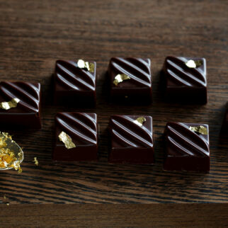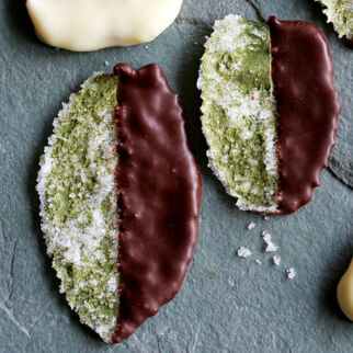 Die Kuvertüre hacken, schmelzen und temperieren. Die Rosenblätter nacheinander etwa zur Hälfte in die Kuvertüre tauchen und auf Backpapier fest werden lassen.