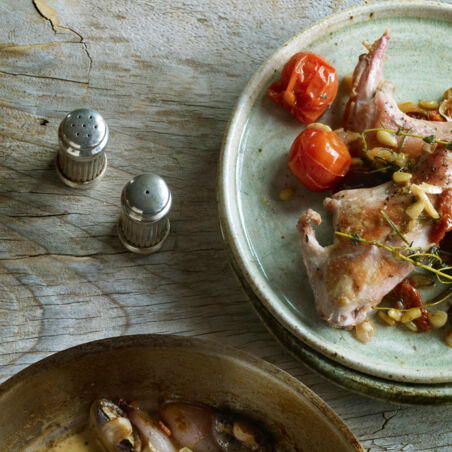 Ein Muss für Liebhaber von Wildgerichten. Das Kaninchen wird lange sanft geschmort. So wird es schön zart und würzig. Dazu schmecken Bandnudeln oder knuspriges Weißbrot.