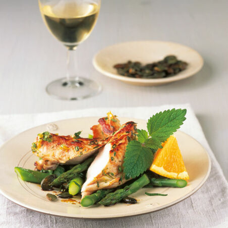 Fein gewürzt und zart gebraten geht das helle Kaninchenfleisch mit dem aromatischen Spargel eine ideale Verbindung ein.