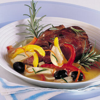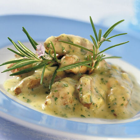 Das Geschnetzelte in heißem Öl goldbraun anbraten. Das Schalotten-Knoblauch-Gemisch und den Senf zufügen und 3 Min. dünsten. Mit dem Fond und der Sahne aufgießen und 10 Min. köcheln lassen. Mit den Kräutern würzen.