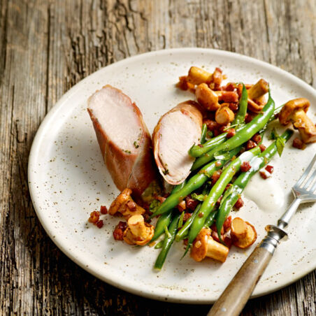 Kaninchenrückenfilets mit Pfifferling-Bohnen-Gemüse