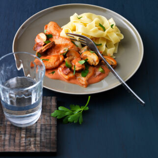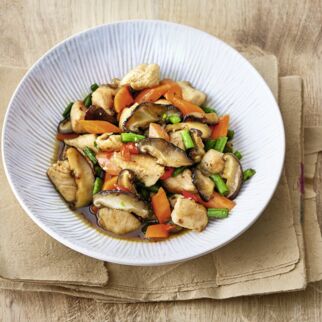 Zuletzt gebratene Fleischwürfel, Schalottenmix, Karamell, Fischsauce und Kokosmilch im Wok mischen, aufkochen und bei mittlerer Hitze 6-8 Min. köcheln lassen. Das Hähnchen mit der Sauce auf vier Tellern anrichten. Dazu passen Reis und frische gemischte Kräuter.
