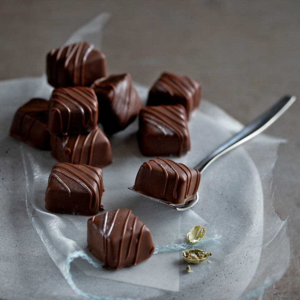Den Rahmen rundum mit dem Messer von der Pralinenmasse lösen. Die Masse in 49 Würfel schneiden. Zum Überziehen die Vollmilchkuvertüre hacken, schmelzen und temperieren.
