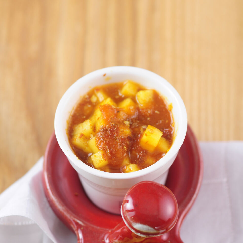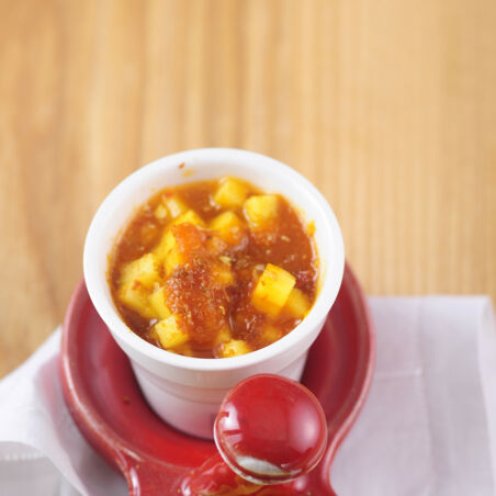 Die Sauce fein pürieren. Mit Salz, Pfeffer, Cayennepfeffer, Zimt und Currypulver abschmecken. Die restlichen Mangowürfel unterheben und die Sauce abkühlen lassen. Zu Rinder-, Schweine- oder Lammsteaks und Geflügel vom Grill servieren.