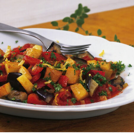 2 EL Olivenöl in einer beschichteten Pfanne erhitzen und die Kartoffelwürfel unter häufigem Rühren knusprig braten. In eine feuerfeste Form geben. Das restliche Olivenöl in der Pfanne erhitzen und das restliche Gemüse unter Rühren anbraten. Mit Oregano, Salz und Pfeffer kräftig würzen. Mit den Kartoffelwürfeln vermischen und zugedeckt im vorgeheizten Backofen (Mitte, Umluft 180°) 45 Min. backen.