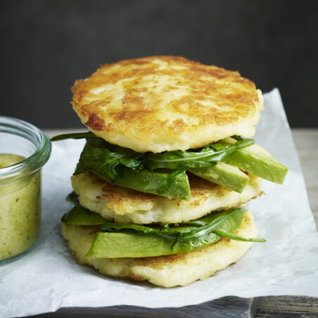 Die Puffer im Wechsel mit der Avocado und dem Rucola auf Teller schichten und die Kartoffel-Avocado-Burger mit dem Ananasdip servieren.