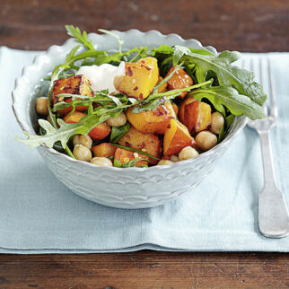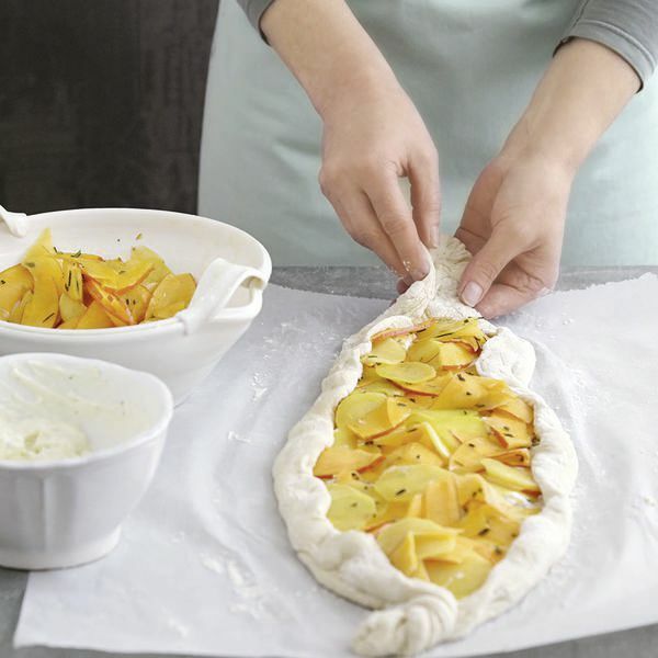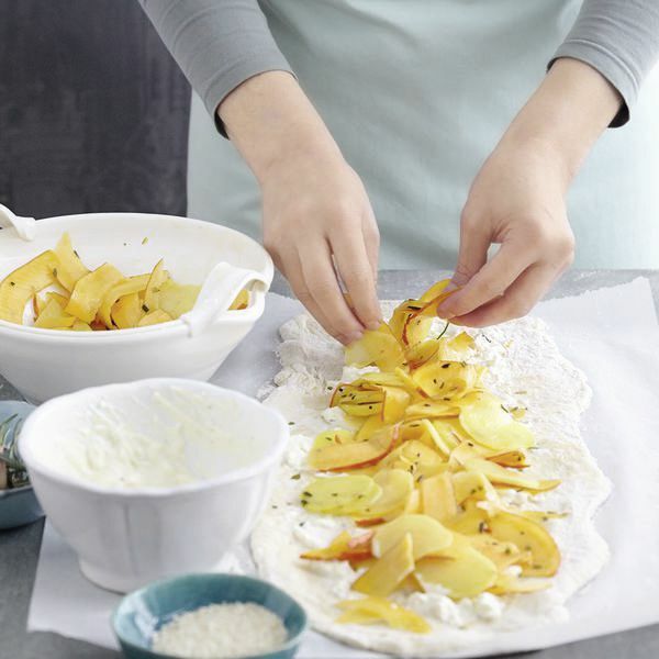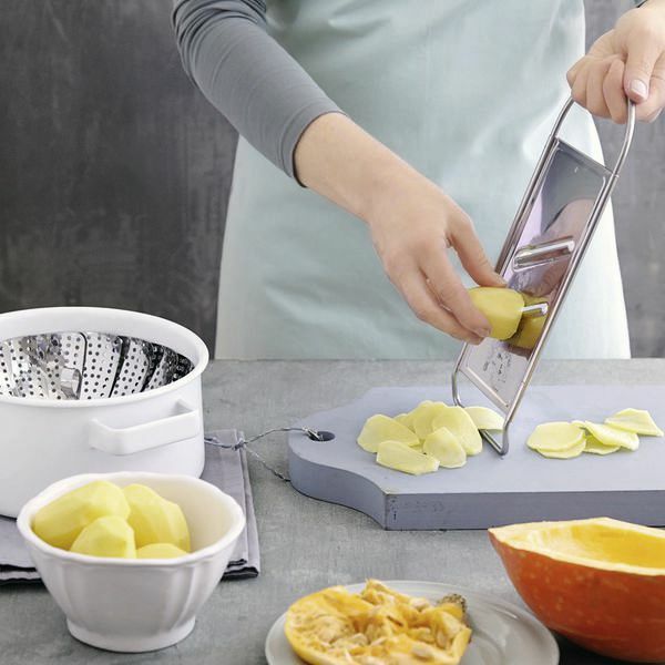 Kartoffeln schälen, waschen, trocken tupfen, Kürbis waschen. Beides mit dem Gurkenhobel dünn hobeln. Nacheinander in einem Topf mit Dämpfeinsatz über kochendem Wasser 2 Min. dämpfen und auf Küchenpapier abkühlen lassen.
