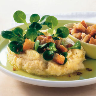 Kartoffeln waschen und in reichlich Salzwasser in ca. 25 Min. weich kochen. Inzwischen die Schalotten schälen und fein würfeln. Die Trüffel abtropfen lassen und fein hacken. Dabei ca. 50 ml Trüffelfond auffangen und beiseitestellen.