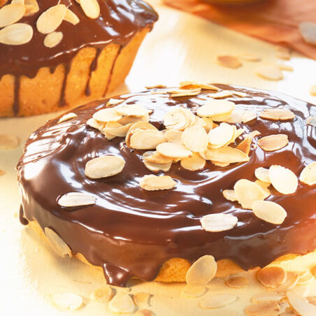 Die Kuvertüre in Stücke brechen, mit dem Öl im heißen Wasserbad schmelzen lassen. Mandeln mit Puderzucker in einer Pfanne ohne Fett leicht rösten. Den Kuchen gleichmäßig mit der Schokoladenglasur überziehen. Den Kuchenrand mit den Mandelblättchen garnieren.