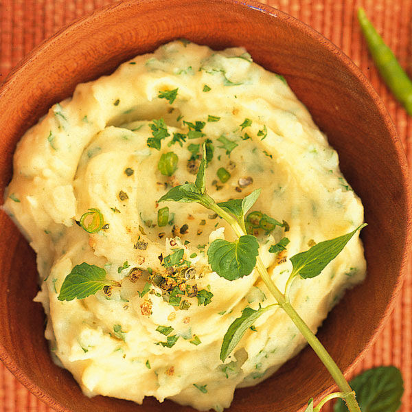 Heiße Milch und Butter mit dem Schneebesen unter die Kartoffelmasse rühren. Kräuter und Chili unterheben. Das Püree mit Salz und grünem Pfeffer abschmecken. Schmeckt zu Steaks und Fisch.