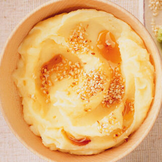 Eine raffinierte Variation des Klassikers. Durch Safran wird der schlichte Kartoffelbrei schön gelb, die gerösteten Mandeln bringen nussiges Aroma.