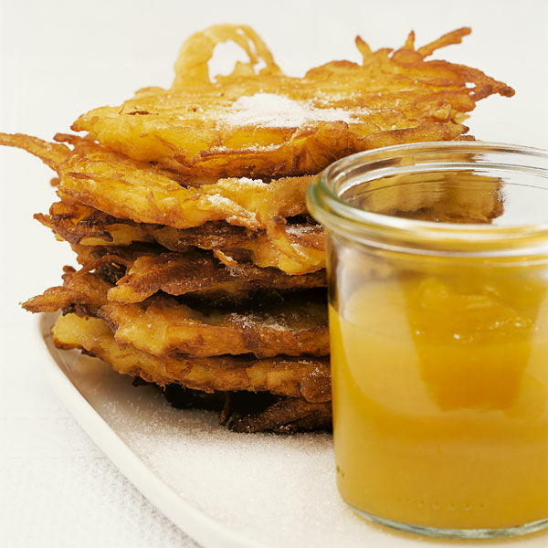Die heißen Puffer auf der warmen Platte servieren und das gekühlte Apfel-Mango-Mus extra dazu reichen.