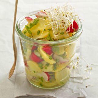 Die Radieschen und die Zwiebeln unter den Salat mischen, abschmecken. Kresse oder Portulak aufstreuen. Sofort servieren.