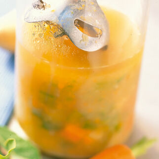 In einem Topf 3 EL Öl erhitzen und Suppengemüse und Kartoffeln darin in ca. 5 Min. rundum anbraten. 600 ml Wasser dazugießen, Thymian und 1 TL Salz hinzufügen und alles zugedeckt bei mittlerer Hitze ca. 15 Min. köcheln lassen.