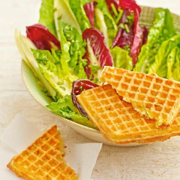 Die noch warmen Waffeln servieren. Zu dieser Rösti-Variante passt ein würzig angemachter Blattsalat mit Schnittlauch und Petersilie.