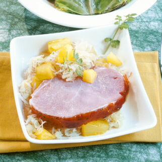 Eine saftige Angelegenheit! Apfel und Sauerkraut passen idealerweise zum Kasselerbraten. Wir haben den Apfel gleich als fruchtigen Schmorsaft in unser Rezept eingefügt.