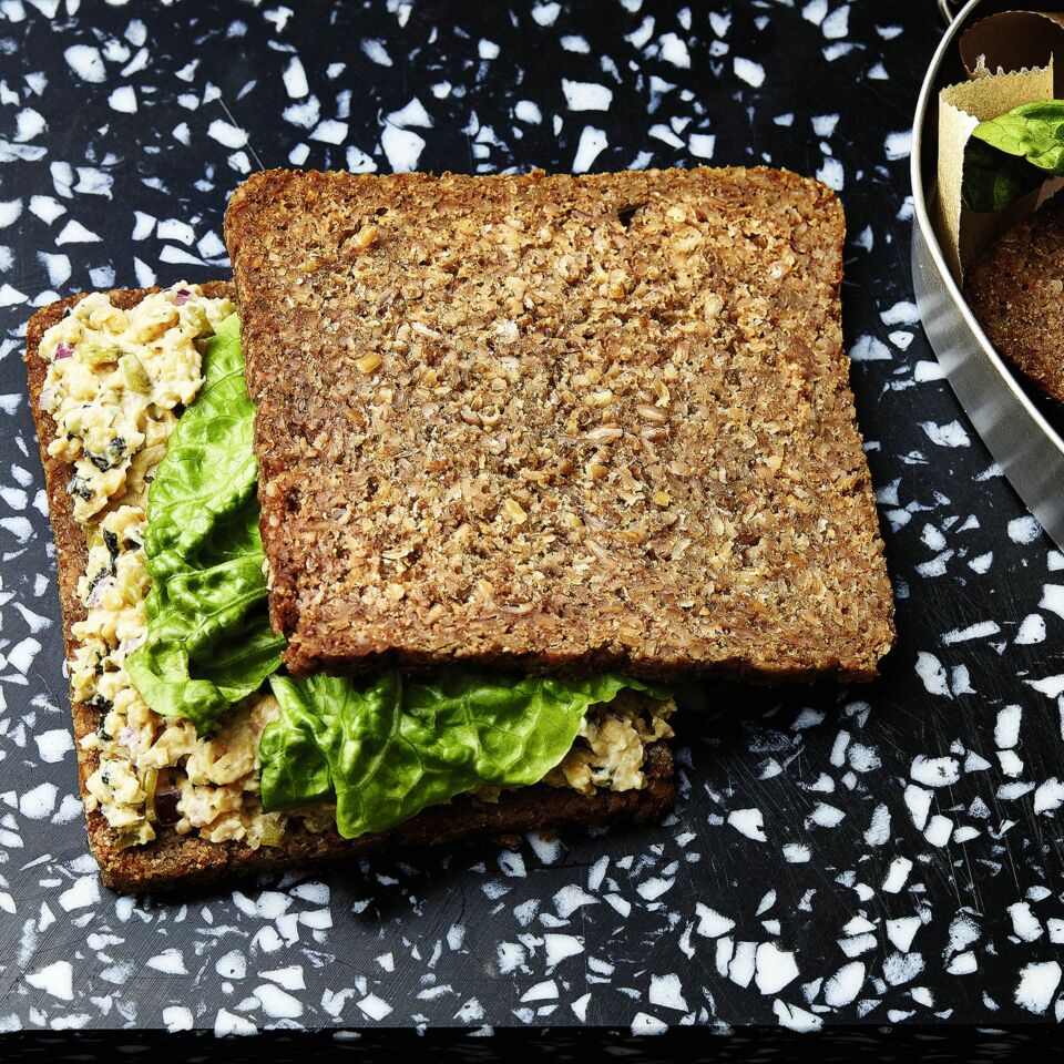 Eine Creme aus Kichererbsen, Zwiebeln, Gewürzgurken, Senf und veganer Mayo ersetzt bei diesem Sandwich den Thunfisch. Toll zum Vorbereiten und Mitnehmen.