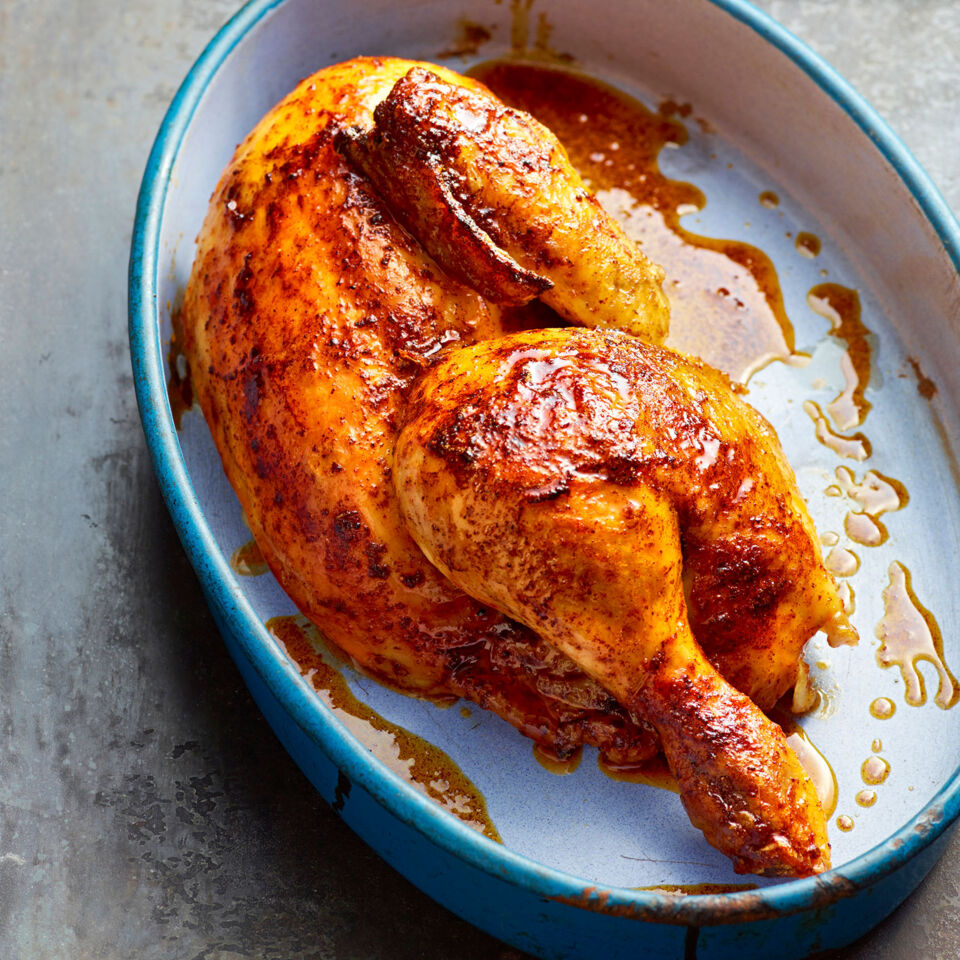 Nur zehn Minuten Vorbereitung, dann geht's ab in den Ofen: Das Hähnchen auf die Keulenseite legen, so bleibt es schön saftig.