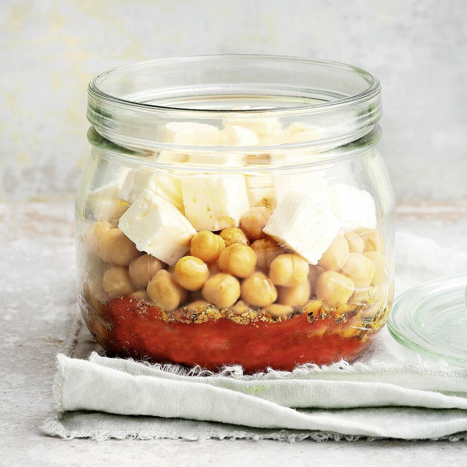 Zuerst die Tomaten auf die Gläser verteilen. Nacheinander Ras el Hanout, Brühepulver, Salz, Pfeffer, Kichererbsen und Feta darüberschichten. Die Gläser verschließen und in den Kühlschrank stellen.