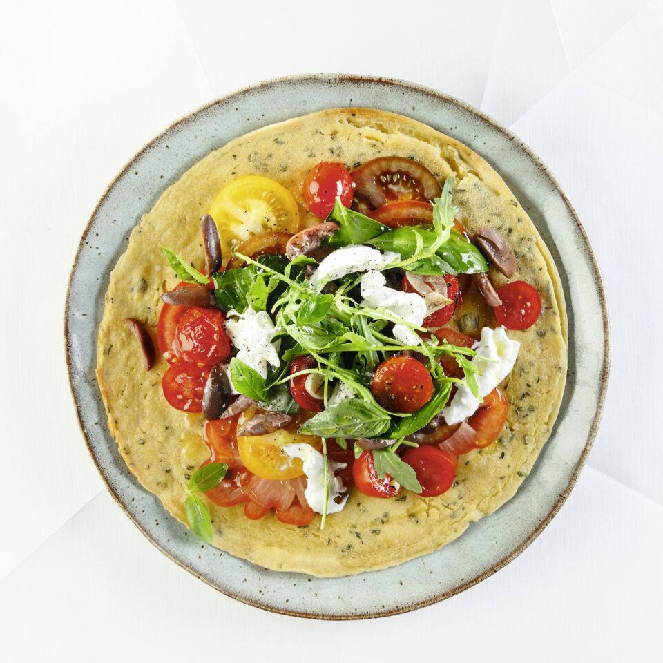 Socca ist ein dünner glutenfreier Pfannkuchen aus Kichererbsenmehl, der nach Belieben mit Gemüse und anderen frischen Zutaten belegt wird.