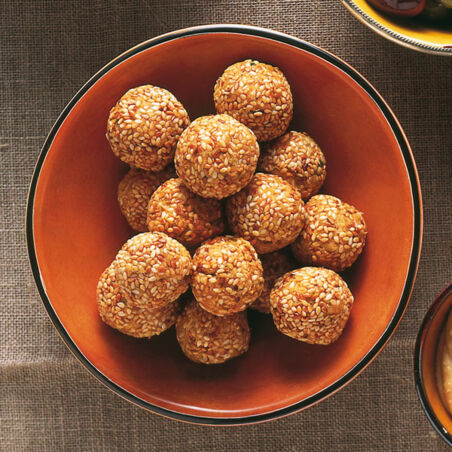 Teig in 4 Portionen teilen, aus jeder Portion 2 (oder 4 kleinere) Bällchen formen, in Sesam wälzen. Öl erhitzen, bis an einem hineingehaltenen Holzstäbchen Bläschen aufsteigen. Bällchen darin portionsweise in 2-3 Min. frittieren. Auf Küchenpapier entfetten. Mit Sesamsauce (siehe Rezept-Tipp) anrichten.