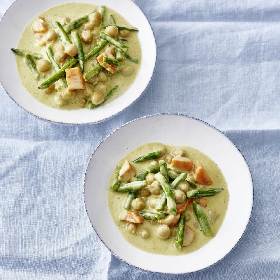 Die Currypaste unter das Gemüse mischen, salzen und die Kokosmilch angießen. Die Kichererbsen in ein Sieb abgießen und untermischen. Das Gemüse zugedeckt in ca. 10 Min. gar köcheln lassen. Das Curry mit Salz abschmecken. Dazu passt Reis, Hirse oder Bulgur.