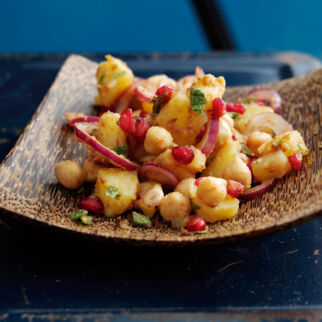 Kurz vor dem Servieren die Mandelstifte in einer Pfanne ohne Fett leicht braun rösten und abkühlen lassen. Dann die übrigen Granatapfelkerne und die restliche Minze über den Salat geben. Das Chaat Masala vorsichtig darüberstreuen – je nach Geschmack mehr oder weniger.