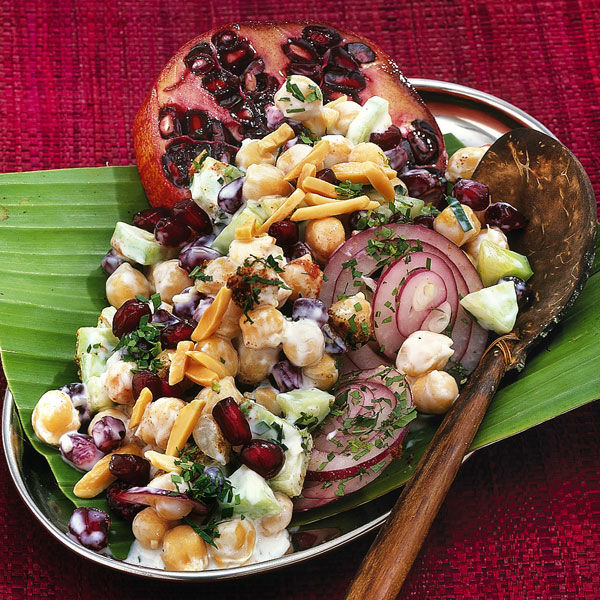 Der Salat aus Kichererbsen und Granatapfelkernen ist ein erfrischender Sattmacher an heißen Tagen. Er schmeckt ganz pur mit Brot oder als Beilage zu gegrilltem Fleisch.
