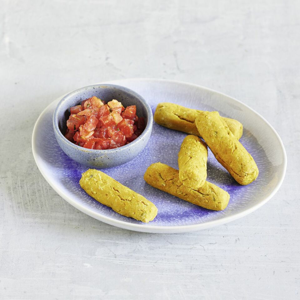 Aus dem Kichererbsenteig mit angefeuchteten Händen nach und nach 16 ca. 6 cm lange Stangen formen. Die Stangen auf das Blech legen und im Ofen (Mitte) ca. 20 Min. backen. Herausnehmen und auf einem Kuchengitter auskühlen lassen. Die Stangen können auch eingefroren und bei Bedarf bei Raumtemperatur aufgetaut werden.
