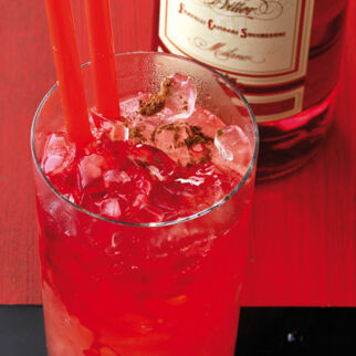 Das Ganze mit eiskaltem Tonic Water vorsichtig aufgießen. Die Cocktailkirschen in das Glas geben und den Drink mit dem Trinkhalm sofort servieren.