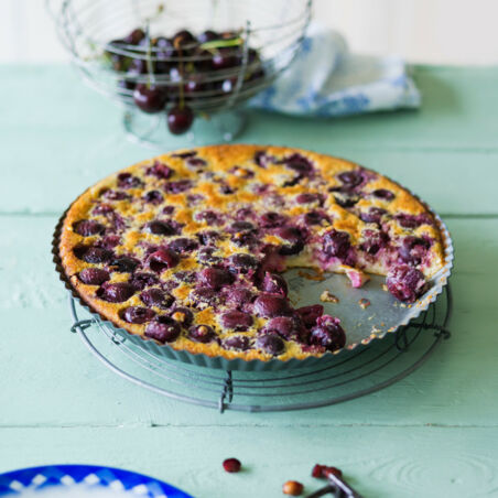 Den Backofen auf 200° vorheizen. Eine Auflaufform (ca. 30 x 20 cm) fetten. Die Kirschen waschen, auf Küchenpapier trocken tupfen und entsteinen. Die Kirschen gleichmäßig in der Form verteilen.