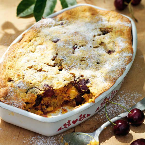 Den Teig in die Form füllen und im heißen Ofen (Mitte, Umluft 160°) ca. 1 Std. 15 Min. backen. Herausnehmen und in der Form ca. 10 Min. abkühlen lassen. Vor dem Servieren mit Puderzucker bestäuben. Der Kirschenplotzer schmeckt lauwarm am besten.