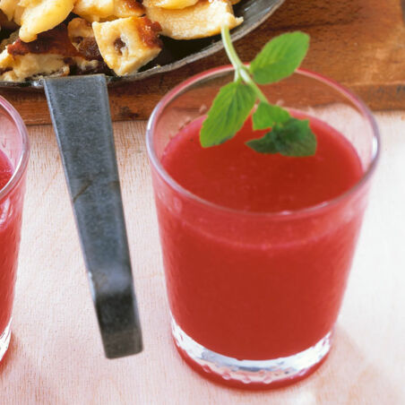Speisestärke mit etwas kaltem Wasser anrühren, in den kochenden Fruchtsaft einrühren und einmal aufkochen lassen. Vom Herd nehmen und abkühlen lassen. Das Püree in Dessertgläser füllen und im Kühlschrank 3-4 Std. kühlen. Mit Minzeblättchen garniert servieren.