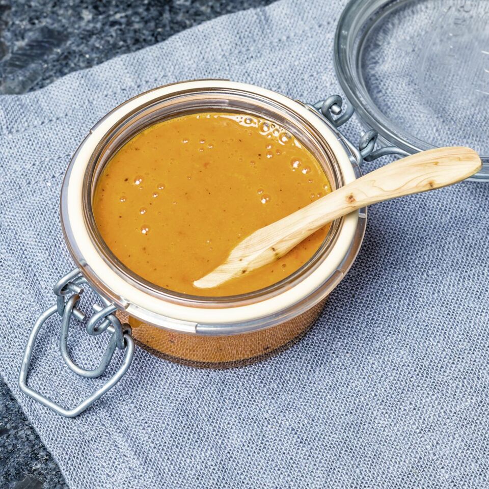 Die Mischung danach in den Mixer füllen. Limettensaft, Zucker, Koriander, BBQ-Sauce und ½ TL Salz zugeben und verschließen. Den Mixer zuerst auf kleinster Stufe starten, dann alles auf höchster Stufe in 40-50 Sek. fein pürieren. (Alternativ die Zutaten in einen hohen Rührbecher geben und mit dem Pürierstab fein mixen.) Das Ketchup schmeckt zu frittiertem oder gegrilltem Fleisch und ganz besonders zu Pommes frites.