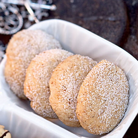 Nach und nach die Teigstreusel mit den Händen zügig zu kleinen Kugeln (ca. 2 cm Ø) formen, diese auf das Blech setzen und etwas flach drücken. Im Ofen (Mitte) in ca. 20 Min. hell backen. Dann die Plätzchen sofort noch heiß vorsichtig in den restlichen Zucker drücken und darin wenden. Auf einem Kuchengitter auskühlen lassen.