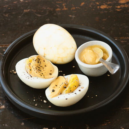 Eier herausnehmen, pellen, längs halbieren und die Eigelbe herauslösen. Eiweißmulden mit einigen Tropfen Essig und Öl beträufeln und pfeffern. Eigelbe in die Mulden setzen und mit Senf bestreichen.