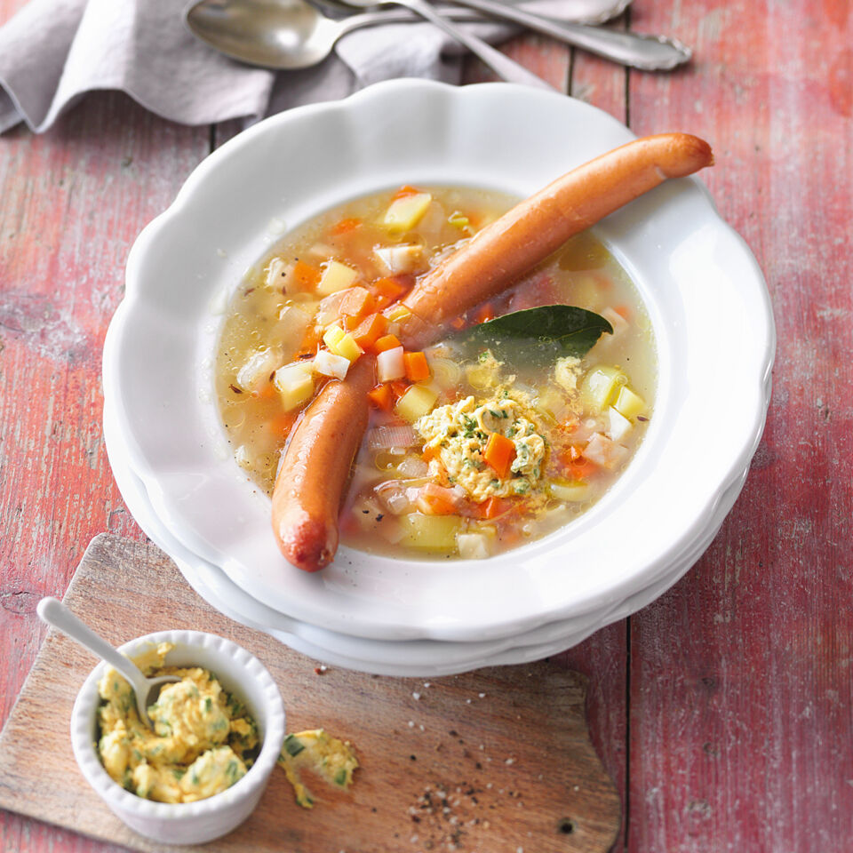 Die Suppe aufkochen und vom Herd nehmen, die Würstchen hineingeben und zugedeckt ca. 5 Min. ziehen lassen. Den Kartoffeleintopf mit den Würstchen in tiefe Teller verteilen und jeweils 1 EL Senfbutter daraufgeben.