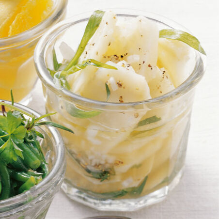 Die Zwiebel schälen und sehr fein würfeln. Mit Salz, Pfeffer, Essig, Öl und etwa 75 ml Kochbrühe unter den Sellerie mischen. Zugedeckt etwa 1 Std. bei Zimmertemperatur marinieren.